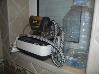 Aproveitamos o parapeito da janela para pôr os 2 ferros e a água destilada, o Joel disse " pensava que era desta que o parapeito ficava sem nada!"